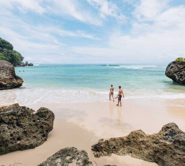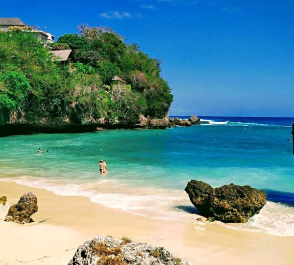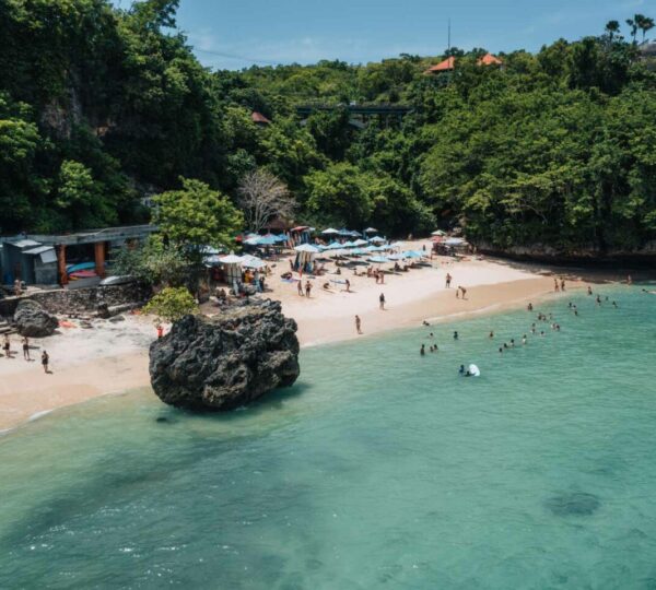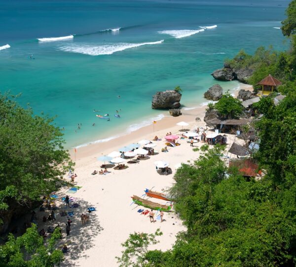 • Our journey begins at Padang Padang Beach, where calm waves and soft white sands await. Surrounded by high cliffs, this beach exudes an exotic charm. Although not wide, it captivates with its natural beauty. Fun fact: Padang Padang Beach was featured in the Hollywood movie “Eat, Pray, Love.” Explore its nooks and crannies, and let the ocean breeze carry your worries away.